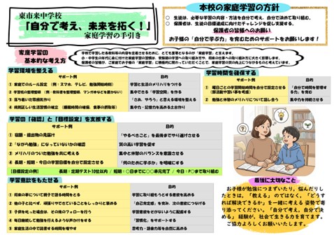このことから,今回,子供たちの適切な家庭学習の習慣化につなげられるように,保護者の方々が,どのようにして家庭学習と向き合う子どもたちと接していけばよいのか,具体的な事例と一緒に,御協力いただきたいことをまとめた保護者向けの「家庭学習の手引き」を作成しました。生徒・保護者の皆様の一助になれば幸いです。